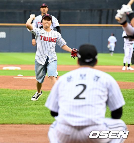 [OSEN=잠실, 이대선 기자] 19일 오후 서울 잠실야구장에서 2025 신한 SOL Bank KBO리그 LG 트윈스와 롯데 자이언츠의 경기가 열렸다. LG는 에르난데스, 롯데는 데이비슨을 선발 투수로 내세웠다. 경기에 앞서 LG 문보경 닮은꼴 팬 백소연이 시구를 하고 있다. 2025.07.19 /sunday@osen.co.kr