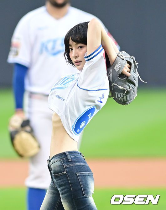 [OSEN=수원, 김성락 기자] 19일 오후 수원 KT위즈파크에서 ‘2025 신한 SOL Bank KBO리그’ KT 위즈와 한화 이글스의 경기가 열렸다. 홈팀 KT는 헤이수스, 방문팀 한화는 와이스를 선발로 내세웠다. 방송인 아라타 모모코가 시구를 하고 있다. 2025.07.19 / ksl0919@osen.co.kr