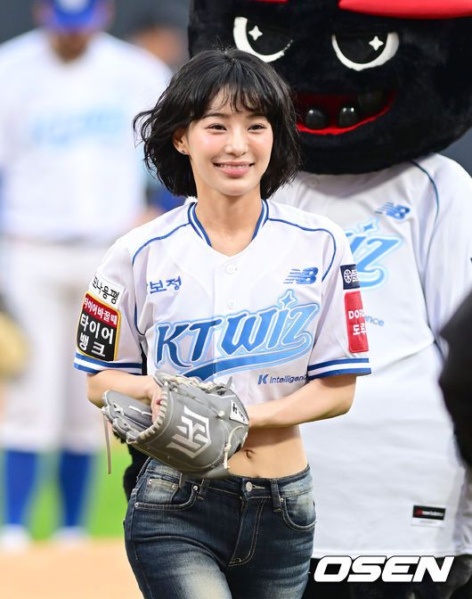 [OSEN=수원, 김성락 기자] 19일 오후 수원 KT위즈파크에서 ‘2025 신한 SOL Bank KBO리그’ KT 위즈와 한화 이글스의 경기가 열렸다. 홈팀 KT는 헤이수스, 방문팀 한화는 와이스를 선발로 내세웠다. 방송인 아라타 모모코가 시구를 하고 있다. 2025.07.19 / ksl0919@osen.co.kr