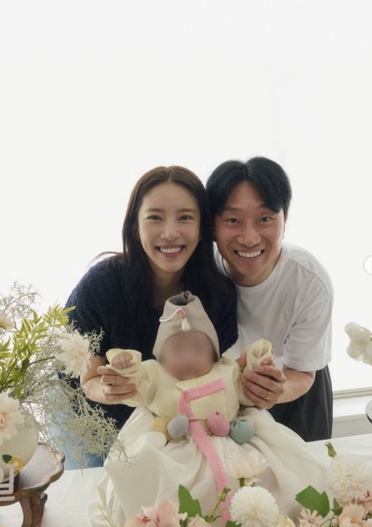 손담비 이규혁 부부는 딸의 백일잔치를 열고 기념사진을 찍었다. 귀여운 한복을 차려입은 딸의 손을 잡은 손담비 부부의 얼굴에 환한 미소가 가득하다.