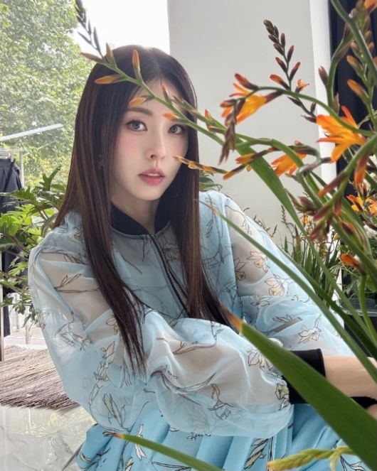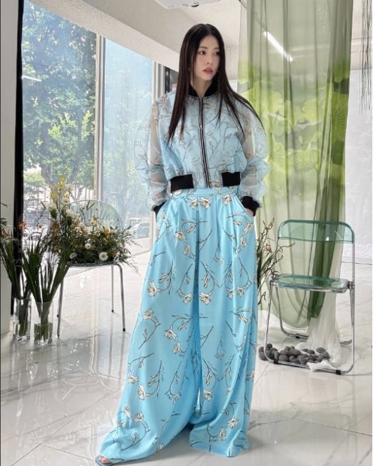 투명한 시스루 소재의 집업 점퍼와 와이드 핏 바지까지 같은 패턴으로 통일해 자연 속에서 막 걸어나온 듯한 ‘화단 인형’ 같은 스타일을 보여줬다. 우아한 반묶음 헤어와 수수한 메이크업으로 화사함을 더했고, 주변에는 생화 장식과 함께 산뜻한 감성이 가득했다.