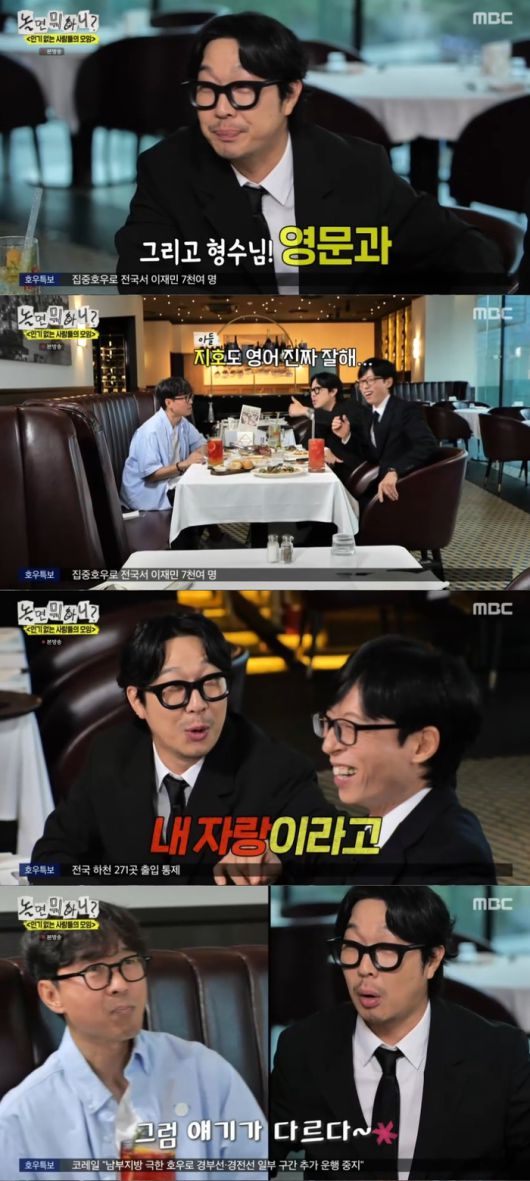 이에 유재석은 “아니 내가 고졸인 건 맞는데 근데 왜 (손가락질을)”이라며 어이없어했다. 하하가 “그리고 형수님! 영문과! 지호도 영어 진짜 잘해. 네이티브야! 아니 내 자랑이라고”라며 칭찬하자 유재석은 “아니 근데 왜 네가 말해?”라며 의아해했다.