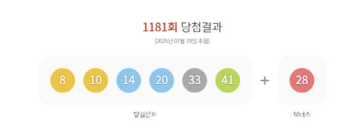 [이데일리 박종화 기자] 로또복권 운영사 동행복권은 19일 제1181회 로또 추첨 결과 1등 당첨번호가 ‘8, 10, 14, 20, 33, 41’라고 밝혔다. 보너스 번호는 ‘28’이다.