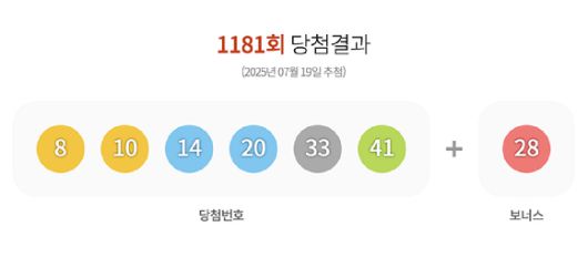 [아이뉴스24 김효진 기자] 로또복권 운영사 동행복권은 제1181회 로또복권 추첨 결과 '8, 10, 14, 20, 33, 41'이 1등 당첨번호로 뽑혔다고 19일 밝혔다. 2등 보너스 번호는 '28'이다.