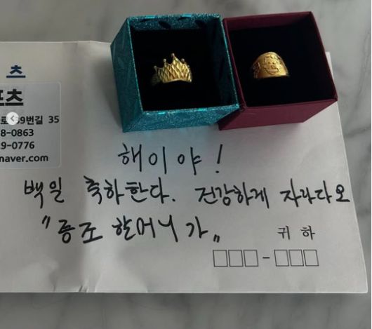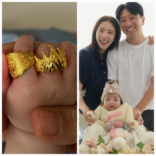 사진에서는 가족의 행복한 미소가 돋보였다. 증조할머니가 준비한 금반지는 해이의 작은 손에 쏙 들어가는 크기로 눈길을 끌었다. 하나는 왕관 모양으로 화려한 포인트를 줬고, 또 하나는 꽃 문양이 새겨진 전통 반지로 따스한 마음을 전했다. 깔끔한 화이트 배경과 화사한 꽃 장식 속에서 세 식구의 가족사진은 보는 이들의 미소를 자아냈다.