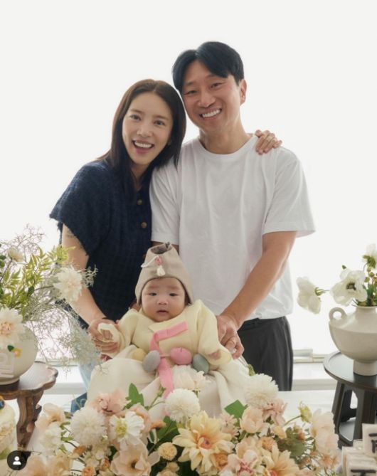 9일 공개된 사진 속 손담비는 남편 이규혁, 딸 해이와 함께 환하게 웃으며 백일상을 완성했다.
