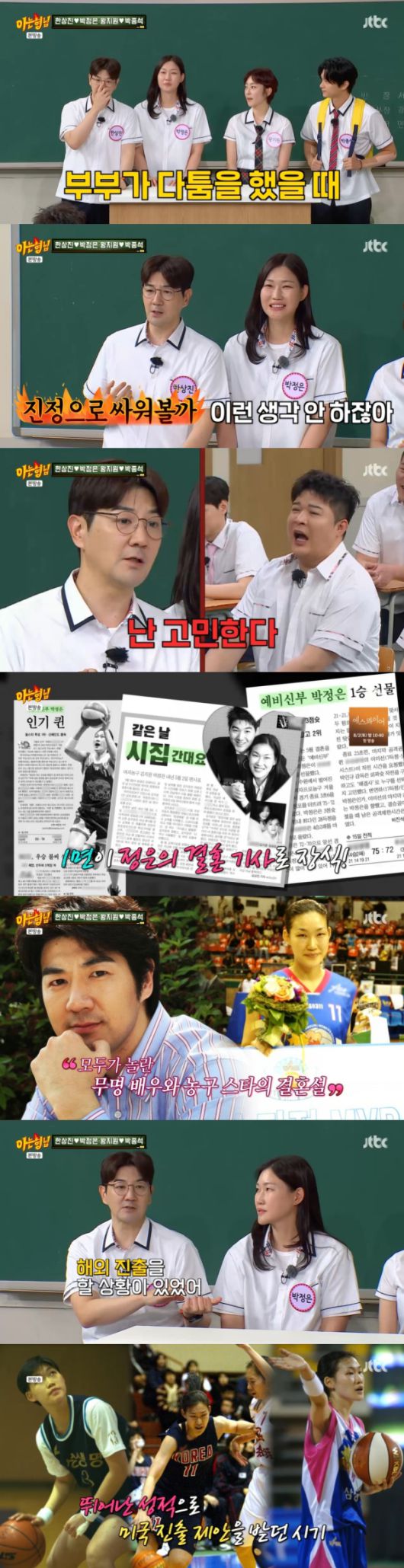 19일 방송된 JTBC '아는 형님'에는 스포츠 스타와 배우 부부 특집으로 배우 한상진과 농구감독 박정은 부부, 배우 왕지원과 발레리노 박종석 부부가 출연했다.