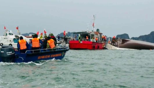 19일 베트남 북서부의 유명 관광지인 하롱베이에서 관광선이 전복돼 구조대가 승객 구조 작업을 벌이는 모습. <출처=VN 익스프레스 갈무리> |