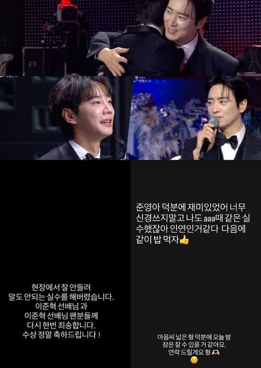 심지어 그는 시상식이 끝난 뒤 SNS를 통해 한번 더 "현장에서 잘 안 들려 말도 안 되는 실수를 해버렸다. 이준혁 선배님과 팬분들께 죄송하다. 수상 정말 축하드린다"라고 사과했고, 이에 이준혁 또한 "준영아 덕분에 재미있었다. 너무 신경 쓰지 마라. 나도 AAA 때 같은 실수 했다. 인연인 것 같다. 다음에 같이 밥 먹자"라고 SNS를 통해 위로하자 "마음씨 넓은 형 덕분에 오늘 밤 잠은 잘 수 있을 것 같다. 연락드리겠다"라고 화답해 개운한 마무리까지 보여줬다.