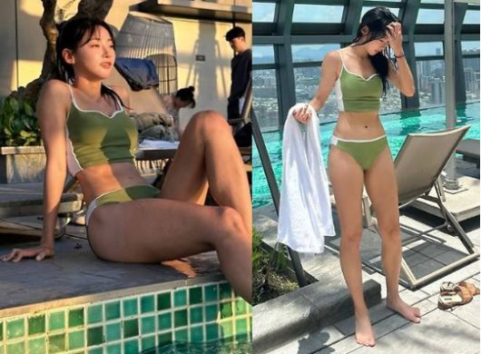 김민지는 이날 그린 컬러 브라탑 스타일 비키니를 선택해 스포티하면서도 시크한 매력을 발산했다.
