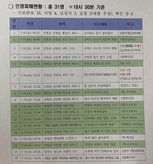 발생 시간대별 지역과 사고 내용을 보면 오전 9시25분께 산사태로 산청군 산청읍 병정리 444-1 주택이 토사에 휩쓸려 심정지 상태의 1명을 구조해 병원으로 이송했다.