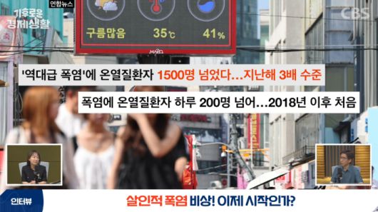 그럼 오늘은 아마 시청자들 제일 관심이 있으실 폭염에 대해 이야기해보겠습니다. 너무 더운데 지금 7월이고 이러면 8월은 어떻게 견디냐 하는 얘기 많이 나오는데요. 온열질환자나 심지어 근로 현장에서 사망자까지 나오는 상황이에요. 지금 현황은 어떤가요?