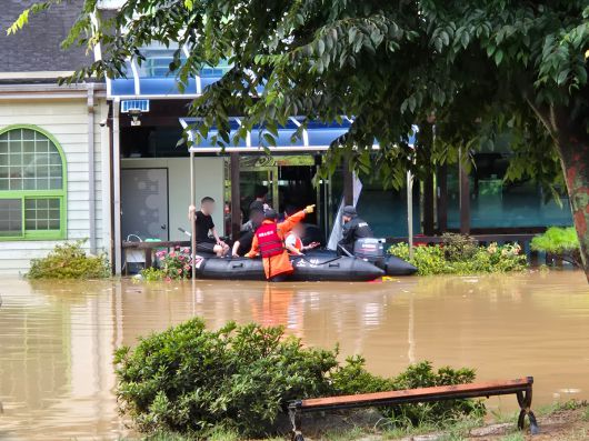 19일 오후 경남 의령군 대의면 일대 마을이 집중호우로 침수돼 소방대원들이 보트를 이용해 고립된 마을 주민들을 구조하고 있다. 소방청 제공. 뉴스1 |