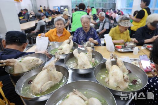 [인천=뉴시스] 전진환 기자 = 초복을 이틀 앞둔 18일 오전 인천 연수구 대한적십자사 인천지사 내 사랑의 급식소에서 적십자봉사원들이 취약계층 어르신들에게 삼계탕을 배식하고 있다. 2025.07.18. amin2@newsis.com |