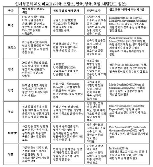 국제정치학자 로버트 엘지(Robert Elgie, 2011)는 『의원내각제 국가의 내각책임성과 정치적 책임(Responsibility and Cabinet Selection in Parliamentary Democracies)』에서 "공식 청문절차는 없지만, 정당 시스템이 사전 정화 기능을 하며 언론과 시민사회가 비공식 청문회의 역할을 수행한다"고 지적하였다.