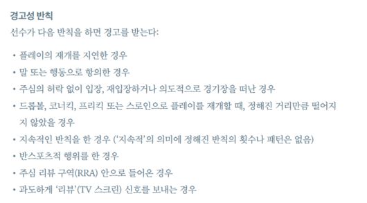경고의 이유는 경기 규칙서 제 12조 경고성 반칙에 나와있다. 주심의 허락없이 입장, 재입장하거나 의도적으로 경기장을 떠난 경우 선수는 경고를 받는다