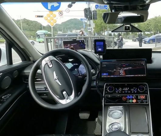 운전석이 텅 빈 제네시스 GV80. 핸들을 잡는 사람은 없지만 이 차량은 최고 시속 50㎞로 부드럽게 달렸다. 이 차량은 서울 마포구 상암동에서 운행 중인 한국 스타트업 라이드플럭스의 자율주행차다.