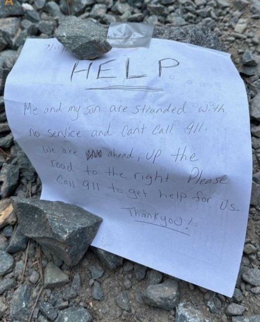 이 쪽지에는 “HELP(도와주세요) 나와 내 아들이 휴대전화가 먹통인 채로 발이 묶여 있어요. 우리는 오른쪽 도로 위쪽에 있어요. 911에 전화해서 도움을 요청해주세요. 감사합니다”라고 쓰여 있었다.