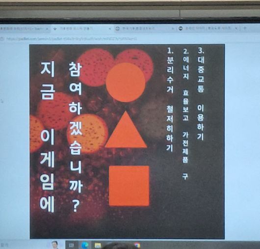 [이데일리 김응열 기자] 칠판 가운데 놓인 대형 모니터 화면 위에 넷플릭스 드라마 ‘오징어게임’을 연상시키는 포스터가 띄워졌다. 위에서 아래로 빨갛게 그려진 원, 삼각형, 사각형 오른쪽에는 ‘분리수거 철저히 하기’, ‘에너지 효율보고 가전제품 구매’ ‘대중교통 이용하기’라는 문구가 쓰였다. 포스터는 ‘지금 이 게임에 참여하시겠습니까’라고 제안하고 있었다.