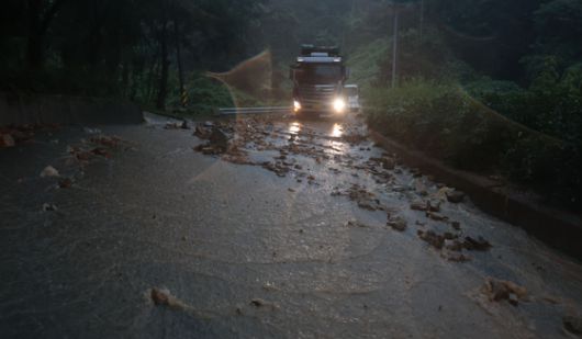 폭우로 인해 19일 오후 경남 산청군 단성면 한 도로에 산사태가 발생, 돌과 나무 등이 깔려 있다. 연합뉴스 |