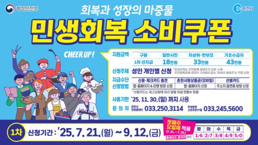 [스포츠서울ㅣ춘천=김기원기자]춘천시(시장 육동한)가 전 시민을 대상으로 ‘민생회복 소비쿠폰’ 1차 지급을 시작한다. 신청 기간은 7월 21일부터 9월 12일까지다.