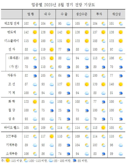 세부 업종별로는 반도체(142), 디스플레이(115), 화학(123), 바이오·헬스(105) 등이 ‘맑음’ 수준의 고점을 기록한 반면, 가전(70), 조선(87), 자동차(82), 섬유(93)는 기준선 아래에서 부진한 흐름을 이어갔다.
