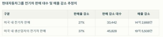 미국 싱크탱크인 전미경제연구소(NBER)에 따르면, 세액공제가 전면 폐지될 경우 미국 내 전기차 판매량이 최대 37% 감소할 수 있는 것으로 추산됐다. 이를 토대로 한경협은 한국 기업의 미국 전기차 판매가 연간 최대 4만5000대 줄고, 이에 따른 매출 손실이 19억5508만 달러에 이를 수 있다고 분석했다.