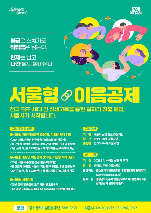 기업은 올해 청년・중장년을 동반 채용하고 1년 이상 고용유지 시 ‘서울형 세대이음 고용지원금’을 통해 납입한 금액(연 192만 원, 최대 3년간 총 576만 원)을 전액 환급받는다. 아울러 기술 이전 및 융합 성과가 우수한 기업은 연 1회 ‘세대 간 상생 고용 우수기업’으로 선정해 포상하고 모범사례도 확산한다.