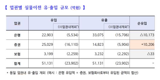 금융감독원과 고용노동부가 20일 발표한 '퇴직연금 실물이전 현황통계'에 따르면 퇴직연금 실물이전 서비스가 시작된 지난해 10월 30일부터 지난 6월 30일까지 8개월 간 은행·보험사에서 증권사로 1조206억원의 적립금이 순유입됐다. 은행과 보험사에서 각각 1조173억원, 33억원이 순유출됐다.
