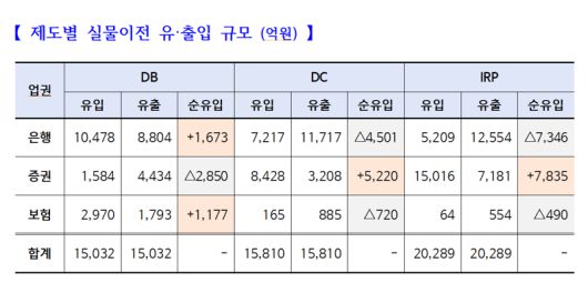 제도별로 살펴보면 개인형 퇴직연금(IRP)에서 머니무브가 가장 컸다. 증권사로 7835억원이 순유입된 반면 은행과 보험사에서 각각 7346억원, 490억원이 순유출됐다. 확정기여형(DC)에서도 은행과 보험사에서 각각 4501억원, 720억원이 빠져나가 증권사로 5220억원이 옮겨갔다.