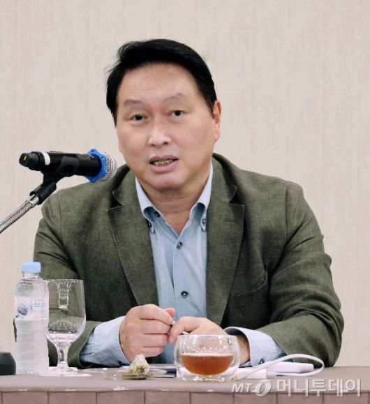 최태원 대한상공회의소 회장이 지난 17일 경북 경주에서 열린 '대한상의 하계포럼' 기자 간담회에서 질의에 응답하고 있다. |
