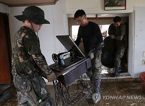 (아산=연합뉴스) 김소연 기자 = 20일 집중호우에 침수 피해가 발생한 충남 아산시 염치읍 일원에서 육군 32사단 장병들이 수해 복구를 하고 있다. 2025.7.20