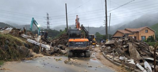 19일 극한호우가 퍼부은 경남 산청군 산청읍 부리의 한 임도에서 포크레인이 무너진 건물 잔해를 제거하고 있다. 사진 독자 |