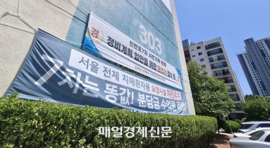 데이케어센터 유치를 두고 재건축 조합 내 갈등을 겪고 있는 서울 신반포 한신 7차 단지에 요양시설 설치 반대 플래카드가 걸려 있다. 이승환 기자 |