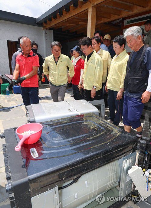 (광주=연합뉴스) 김도훈 기자 = 김민석 국무총리가 20일 집중호우로 침수됐던 광주 북구 용강동에서 수해로 생긴 폐기물을 살펴보고 있다. 2025.7.20