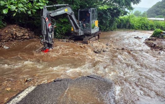 가평군에 이어 포천시에서도 집중 호우로 피해가 속출하고 있다. 사진은 내촌면에서 도로가 유실돼 피해 복구 작업을 하는 모습. 포천시 제공 |