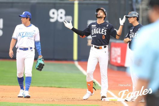 한화 이글스 루이스 리베라토(오른쪽)가 19일 수원 케이티위즈파크에서 열린 2025 KBO리그 케이티 위즈와 경기에서 안타를 치고 출루한 뒤 세리머니를 하고 있다. 리베라토는 정규 계약을 체결한 이날 3안타(4타수)를 쳐냈다. 한화 이글스 제공 |