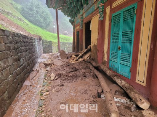 19일 경남 산청 지역에 내린 폭우로 발생한 산사태로 율곡사 대웅전(보물) 건물 일부가 파손됐다. (사진=국가유산청) |