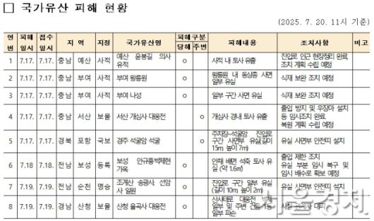 국가유산청 관계자는 “위기 징후 및 국가유산 피해 현황을 파악하는 등 상황을 주시할 것”이라며 “피해 복구를 위한 조사도 준비 중”이라고 밝혔다.