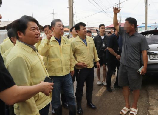 20일 충남 아산시 염치읍 수해 현장을 찾은 김병기(왼쪽 두 번째) 더불어민주당 대표 직무대행 겸 원내대표에게 마을 이장이 피해 상황을 설명하고 있다. /연합 |