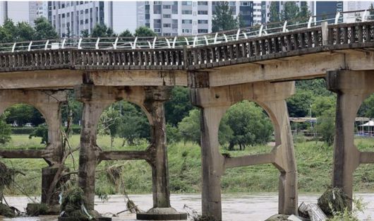 18일 광주 북구 동림동 옛 산동교가 전날 극한 호우에 교각이 파손돼 상판이 휘어 있다. (연합뉴스 제공) |