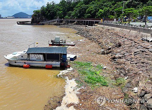 (목포=연합뉴스) 정다움 기자 = 20일 오후 전남 목포시 상동 영산강 하굿둑 인근 강 수면에 최근 내린 폭우로 흘러온 쓰레기와 부유물이 떠 있다. 2025.7.20