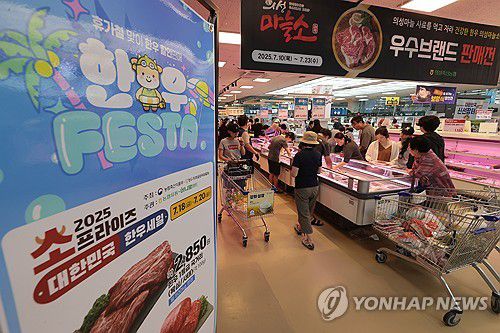 (서울=연합뉴스) 류효림 기자 = 20일 서울 서초구 양재동 농협하나로마트 양재점에서 열린 '소(牛)프라이즈 한우 할인행사'에서 시민들이 한우를 고르고 있다. 2025.7.20