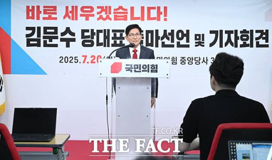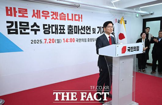 [더팩트ㅣ박헌우 기자] 김문수 전 국민의힘 대통령 후보가 20일 오후 서울 여의도 국민의힘 중앙당사에서 당대표 출마선언을 하고 있다.