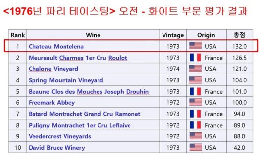 오전에 진행된 화이트 와인 심사에선 샤토 몬텔레나 샤도네이(Chateau Montelena) 1973이 132점을 얻어 부르고뉴 뫼르소 샤름 프리미에 크뤼 훌로(Meursault Charmes 1er Cru Roulot·126.5점)를 따돌리고 1위를 차지합니다. 뿐만 아니라 3위 샬로네 빈야드(Chalone Vineyard) 1974, 4위 스프링 마운틴 빈야드(Spring Mountain Vineyard) 1973 등 5위안에 나파밸리 와인이 3개나 포진합니다.