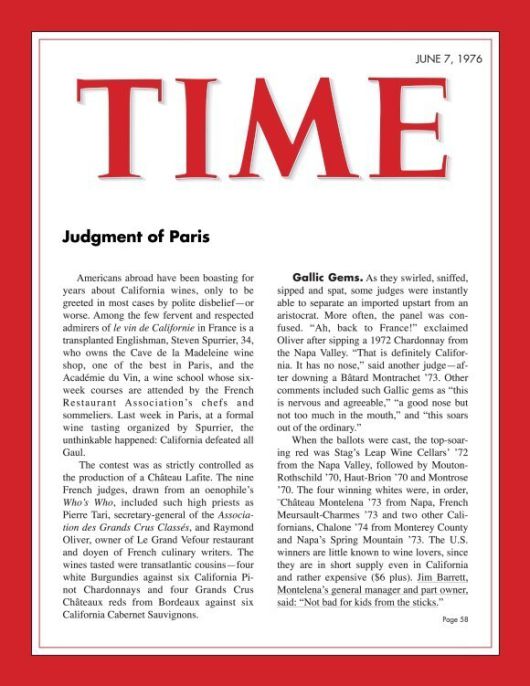 심사 결과는 당시 기자로서는 유일하게 현장에서 취재하던 타임(TIME)지 특파원 조지 M. 테이버 덕분에 그해 6월 7일자 타임지에 ‘파리의 심판(Judgement of Paris)’이라는 제목으로 실리게 됩니다. 기사는 “깜짝 놀랄 일이 일어났다. 캘리포니아가 골(Gaul 프랑스의 옛 이름)을 이겼다”고 전합니다. 프랑스 와인업계는 충격적인 패배를 인정할 수 없어서 10주년인 1986년과 30주년인 2006년 같은 와인으로 재대결을 벌였지만 역시 미국의 승리로 돌아가 파리의 심판이 우연이 아니었음을 입증합니다.