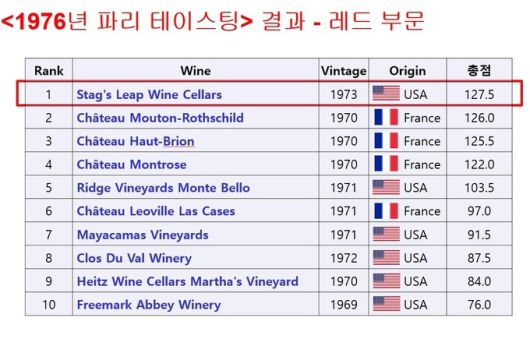 1976년 5월 24일 프랑스 파리 인터콘티넨탈 호텔. 프랑스 ‘5대 샤토’인 그랑크뤼 클라세 1등급 샤토 무통 로칠드, 샤토 오브리옹 등 프랑스 와인과 미국 캘리포니아 나파밸리 와인이 블라인드 테이스팅으로 맞붙었습니다. 당시만 해도 나파밸리는 그저 그런 싸구려 테이블 와인이나 만드는 와인의 변방으로 여겨지던 시기입니다. 하지만 나파밸리 와인은 화이트와 레드에서 모두 1위를 휩씁니다. 고급와인의 기준은 프랑스였기에 대회 결과는 프랑스 와인업계는 물론, 전세계 와인업계를 충격의 도가니로 몰아넣습니다.