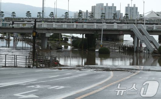 19일 내린 폭우로 울산시 중구 울산교 하부 도로가 물에 잠겨 통제되고 있다. 2025.7.19/뉴스1 ⓒ News1 조민주 기자 |