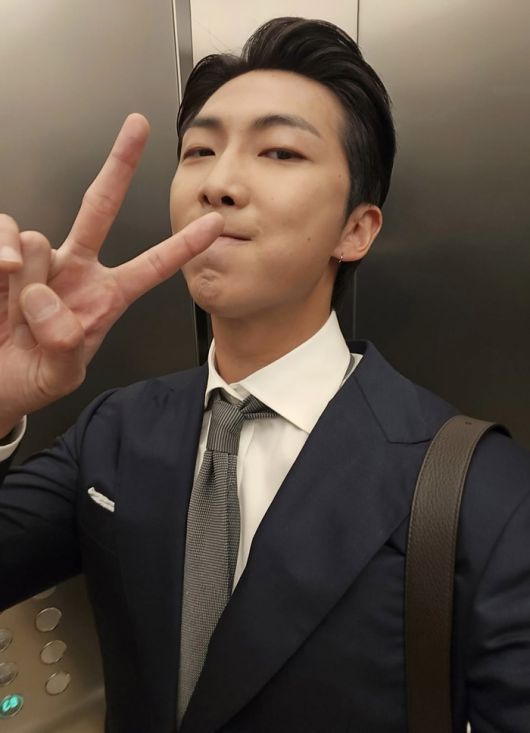 공개된 사진 속 RM은 깔끔하게 정돈된 헤어스타일에 세련된 네이비 슈트와 타이로 멋을 낸 모습이다. 특히 카메라를 향해 브이 포즈를 취하며 입술을 내미는 장난기 넘치는 표정은 그의 댄디하면서도 친근한 매력을 동시에 드러냈다.
