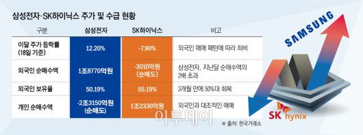 반면, 외국인들은 이달 들어 SK하이닉스 주식 3010억 원어치를 순매도하며 5월과 6월 두 달 연속 이어지던 매수세를 멈췄다. SK하이닉스는 11일 장중 처음으로 30만 원을 돌파하며 고점 부담이 커진 상황이었다. 여기에 외국계 증권사인 골드만삭스가 시장 경쟁 심화로 고대역폭 메모리(HBM) 가격이 내년에 처음으로 하락할 수 있다며 투자의견을 ‘중립’으로 하향 조정한 것이 대규모 매도 물량 확대로 이어진 것으로 보인다. 이러한 외국인의 매매 패턴에 따라 삼성전자 주가는 이달 들어 12.2% 상승한 반면, SK하이닉스 주가는 7.9% 하락했다.